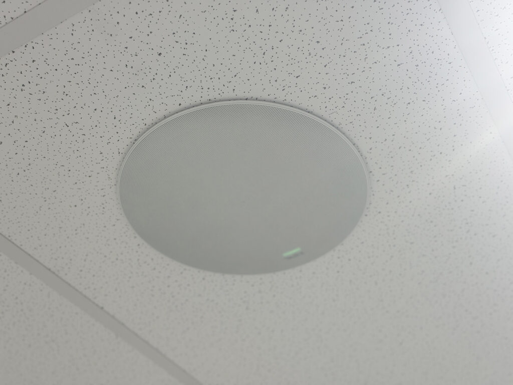 We installed four Yealink CS10 SkySound Ceiling Speakers to deliver even, high-quality audio throughout the boardroom. Two Yealink CM20 Ceiling Microphones—complete with white mesh covers and tile bridges—were ceiling-mounted to capture both presenter and audience dialogue with exceptional clarity.