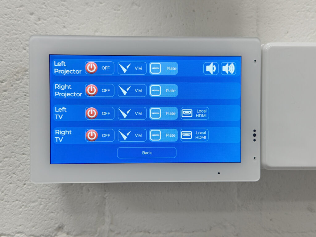 System control was delivered using an XP-6s Control Processor from RTI, supported by CM-232 communication modules enabling existing RS-232 INs control across projectors, displays and matrix switching hardware. User control is provided via an RTI 5” In-wall Touchpanel installed adjacent to the equipment rack, enabling simple, centralised operation.