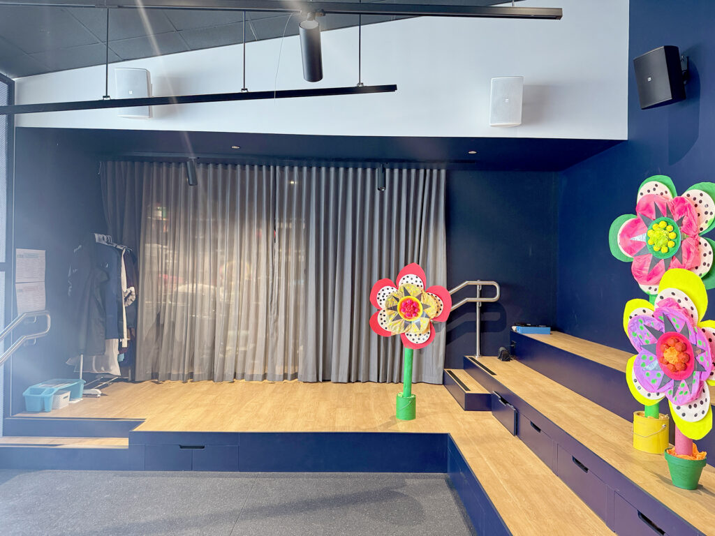 In the Performing Arts Room, Vision One delivered an audio upgrade designed to meet the diverse needs of teaching, rehearsals and performances. Above the stage opening, two Audac VEXO108 High Performance Passive 8” Two-Way Speakers were installed on MBK108V U-Brackets, providing brilliant, high-output sound in a compact, discreet form. An additional two VEXO108 speakers were mounted to the navy wall beside the television, ensuring consistent sound coverage across the teaching and audience zones.