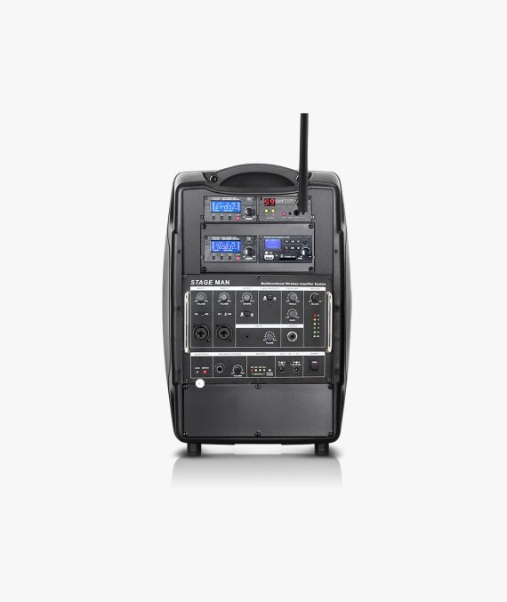The Stage Man supports up to four wireless microphones simultaneously, allowing for seamless communication during events. Its long-lasting lithium battery provides over 10 hours of continuous use, making it perfect for outdoor events or performances without worrying about power. With Bluetooth capabilities for easy music playback and the option to connect to external speakers or amplifiers, the Stage Man is the ultimate solution for any event that demands quality sound and reliability.